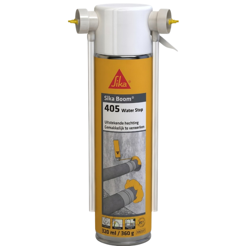 De Sika Boom-405 Water Stop is een 2-componenten, zelf expanderend afdichtingsschuim op basis van polyurethaan dat geen luchtvochtigheid nodig heeft om uit te harden. Deze polyurethaanschuim hardt erg snel uit. De hoge dichtheid en de zeer fijne, overwegend gesloten celstructuur van dit schuim leiden tot een waterdichte afdichting van buisdoorvoeringen, rond leidingen of bij buisverbindingen. Dankzij de speciale verpakking (met twee spuitmonden) kan de verwerking onderbroken worden en later hervat worden door simpelweg de spuitmond te vervangen.